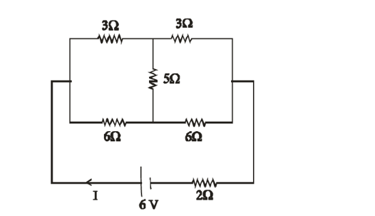 A battery of 6 V is connected to the circuit as shown below. The current I drawn from the battery is