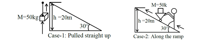 A body of mass 50kg is lifted to a height of 20m from the ground in the two different ways as shown in the figures. The ratio of work done against the gravity in both the respective cases, will be: