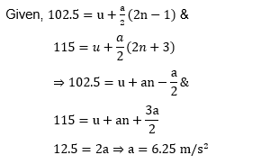 A body travels 102.5 m in $\mathrm{n}^{\text {th }}$ second and 115.0 m in $(\mathrm{n}+2)^{\text {th }}$ second. The acceleration is