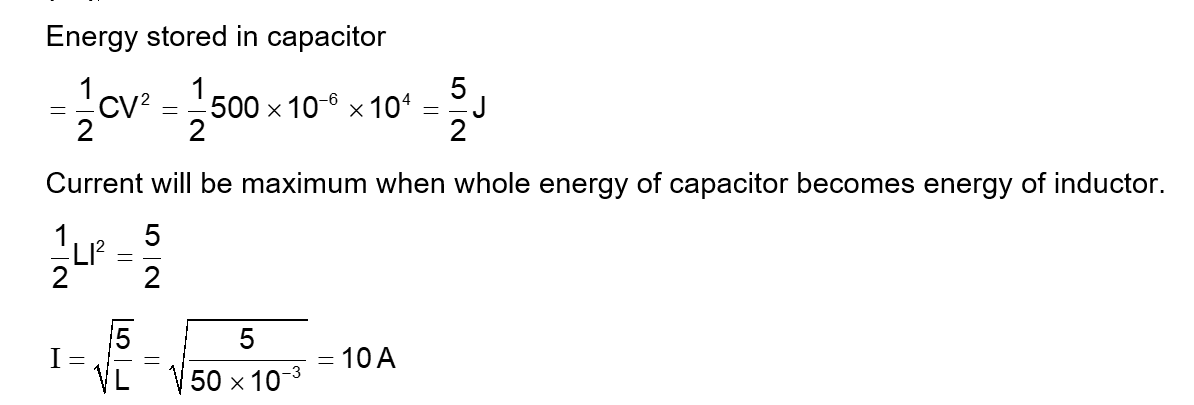 A capacitor of capacitance 500 $\mu \mathrm{F}$is charged completely using a dc supply of 100 V. It is now connected to an inductor of inductance 50 mH to form an LC circuit. The maximum current in LC circuit will be_______A.