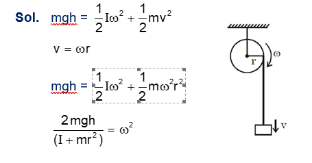 A cord is wound round the circumference of wheel of radius $r$. The axis of the wheel is horizontal and the moment of inertia about it is I . A weight mg is attached to the cord at the end. The weight falls from rest. After falling through a distance ' h ', the square of angular velocity of wheel will be