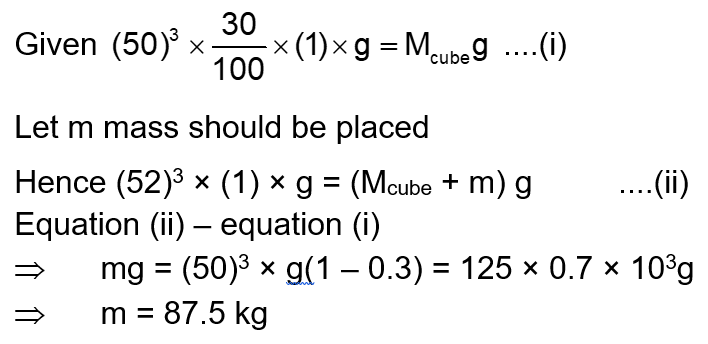 A cubical block of side 0.5 m floats on water with $30 \%$ of its volume under water. What is the maximum weight that can be put on the block without fully submerging it under water?
