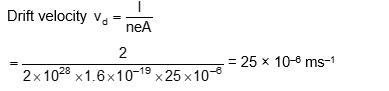 A current of 2 A flows through a wire of cross-sectional area $25.0 \mathrm{~mm}^2$. The number of free electrons in a cubic meter are $2.0 \times 10^{28}$. The drift velocity of the electron is $\_\_\_\_$ $\times 10^{-6} \mathrm{~ms}^{-1}$ (given, charge on electron $\left.=1.6 \times 10^{-19} \mathrm{C}\right)$