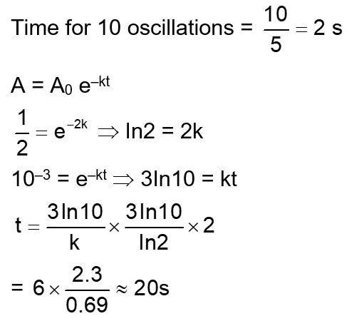 A damped harmonic oscillator has a frequency of 5 oscillations per second. The amplitude drops to half its value for every 10 oscillations. The time it will take to drop to $\frac{1}{1000}$ of the original amplitude is close to: