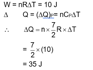 A diatomic gas with rigid molecules does 10 J of work when expanded at constant pressure. What would be the heat energy absorbed by the gas, in this process?