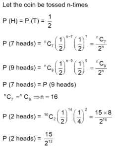 A fair coin is tossed a fixed number of times. If the probability of getting 7 heads is equal to probability of getting 9 heads, then the probability of getting 2 heads is