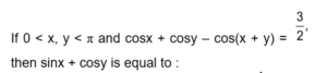$\begin{aligned} & \cos x+\cos y-\cos (x+y)=\frac{3}{2} \\ & \begin{aligned} & \cos ^2\left(\frac{x+y}{2}\right)-\cos \left(\frac{x+y}{2}\right) \cdot \cos \left(\frac{x-y}{2}\right) \\ &+\frac{1}{4} \cdot \cos ^2\left(\frac{x-y}{2}\right)+\frac{1}{4} \sin ^2\left(\frac{x-y}{2}\right)=0\end{aligned} \\ & \Rightarrow \quad\left(\cos \left(\frac{x+y}{2}\right)-\frac{1}{2} \cos \left(\frac{x-y}{2}\right)\right)^2+\frac{1}{4} \sin ^2\left(\frac{x-y}{2}\right)=0 \\ & \Rightarrow \quad \sin \left(\frac{x-y}{2}\right)=0 \text { and } \cos \left(\frac{x+y}{2}\right)=\frac{1}{2} \cos \left(\frac{x-y}{2}\right) \\ & \Rightarrow \quad x=y \text { and } \\ & \therefore \quad \cos x=\frac{1}{2}=\cos y \\ & \quad \sin x=\frac{\sqrt{3}}{2} \\ & \Rightarrow \quad \sin x+\cos y=\frac{1+\sqrt{3}}{2}\end{aligned}$