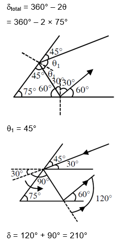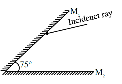A light ray is incident, at an incident angle $\theta_1$, on the system of two plane mirrors $\mathrm{M}_1$ and $\mathrm{M}_2$ having an inclination angle 75° between them (as shown in figure). After reflecting from mirror $\mathrm{M}_1$ it gets reflected back by the mirror $\mathrm{M}_2$ with an angle of reflection 30°. The total deviation of the ray will be .............. degree.