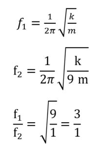 A mass m is suspended from a spring of negligible mass and the system oscillates with a frequency $f_1$. The frequency of oscillations if a mass 9" " m is suspended from the same spring is $f_2$. The value of $\frac{f_1}{f_2}$ is