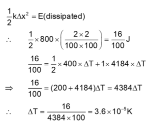 A massless spring (k = 800 N/m), attached with a mass (500 g) is completely immersed in 1 kg of water. The spring is stretched by 2 cm and released so that it starts vibrating. What would be the order of magnitude of the change in the temperature of water when the vibrations stop completely? (Assume that the water container and spring receive negligible heat and specific heat of mass = 400 J/kg K, specific heat of water = 4184 J/kg K)
