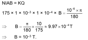 A moving coil galvanometer has a coil with 175 turns and area 1 cm 2 . It uses a torsion band of torsion constant $10^{-6} \mathrm{~N}-\mathrm{m} / \mathrm{rad}$. The coil is placed in a magnetic field B parallel to its plane. The coil deflects by $1^{\circ}$ for a current of 1 mA . The value of B (in Tesla) is approximately