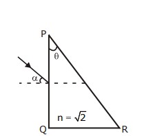 A parallel beam of light is incident from air at angle $\alpha$ on the side PQ of a right angled triangular prism of refractive index $n=\sqrt{2}$. Light undergoes total internal reflection in the prism at the face PR when $\alpha$ has a minimum value of $45^{\circ}$. The angle $\theta$ of the prism is