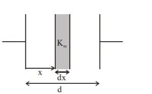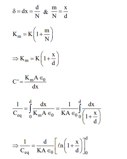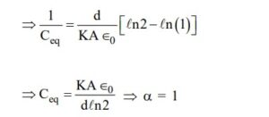 A parallel plate capacitor of capacitance C has spacing d between two plates having area A . The region between the plates is filled with N dielectric layers, parallel to its plates, each with thickness $\delta=\frac{\mathrm{d}}{\mathrm{N}}$. The dielectric constant of the $\mathrm{m}^{\text {th }}$ layer is $\mathrm{K}_{\mathrm{m}}=\mathrm{K}\left(1+\frac{\mathrm{m}}{\mathrm{N}}\right)$. For a very large $\mathrm{N}\left(>10^3\right)$, the capacitance C is $\alpha\left(\frac{\mathrm{K} \in_0 \mathrm{~A}}{\mathrm{~d} / \mathrm{n} 2}\right)$. The value of $\alpha$ will be $\_\_\_\_$ .