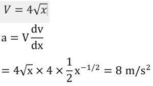 A particle initially at rest starts moving from reference point. x=0 along x-axis, with velocity v that varies as v=$4 \sqrt{\mathrm{x}} \mathrm{m} / \mathrm{s}$. The acceleration of the particle is $\mathrm{ms}^{-2}$ .