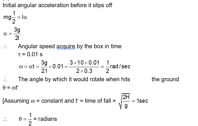 A rectangular solid box of length 0.3 m is held horizontally, with one of its sides on the edge of a platform of height 5 m . When released, it slips off the table in a very short time $\tau=0.01 \mathrm{~s}$, remaining essentially horizontal. The angle by which it would rotate when it hits the ground will be (in radians) close to: