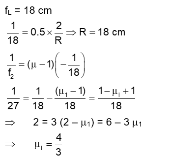 A thin convex lens $L$ (refractive index $=1.5$ ) is placed on a plane mirror $M$. When a pin is placed at $A$, such that $\mathrm{OA}=18 \mathrm{~cm}$, its real inverted image is formed at A itself, as shown in figure. When a liquid of refractive index $\mu_1$ is put between the lens and the mirror, the pin has to be moved to $\mathrm{A}^{\prime}$, such that $\mathrm{OA}^{\prime}=27 \mathrm{~cm}$, to get its inverted real image at $\mathrm{A}^{\prime}$ itself. The value of $\mu$ । will be
