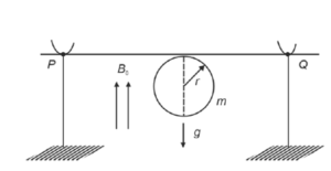 A thin stiff insulated metal wire is bent into a circular loop with its two ends extending tangentially from the same point of the loop. The wire loop has mass $m$ and radius $r$ and it is in a uniform vertical magnetic field $B_0$, as shown in the figure. Initially, it hangs vertically downwards, because of acceleration due to gravity $g$, on two conducting supports at $P$ and $Q$. When a current/ is passed through the loop, the loop turns about the line PQ by an angle $\theta$ given by