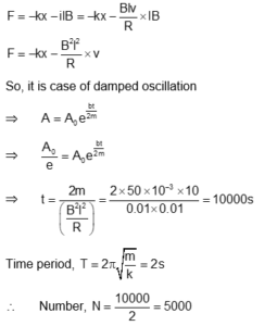 A thin strip 10 cm long is on a U shaped wire of negligible resistance and it is connected to a spring of spring constant $0.5 \mathrm{Nm}-1$ (see figure). The assembly is kept in a uniform magnetic field of 0.1 T . If the strip is pulled from its equilibrium position and released, the number of oscillations it performs before its amplitude decreases by a factor of e is N . If the mass of the strip is 50 grams, its resistance $10 \Omega$ and air drag negligible, N will be close to