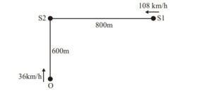 A train S1, moving with a uniform velocity of $108 \mathrm{~km} / \mathrm{h}$, approaches another train S2 standing on a platform. An observer $O$ moves with a uniform velocity of $36 \mathrm{~km} / \mathrm{h}$ towards $S 2$, as shown in figure. Both the trains are blowing whistles of same frequency 120 Hz . When O is 600 m away from S 2 and distance between S 1 and S 2 is 800 m , the number of beats heard by O is $\_\_\_\_$ .