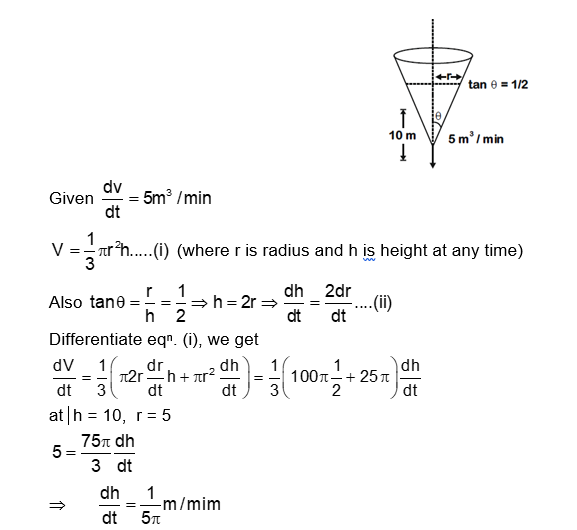 A water tank has the shape of an inverted right circular cone, whose semi-vertical angle is $\tan ^{-1}\left(\frac{1}{2}\right)$. Water is poured into it at a constant rate of 5 cubic metre per minute. Then the rate (in $\mathrm{m} / \mathrm{min}$.), at which the level of water is rising at the instant when the depth of water in the tank is 10 m ; is: