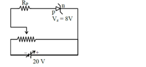A zener diode having zener voltage 8 V and power dissipation rating of 0.5 W is connected across a potential divider arranged with maximum potential drop across zener diode is as shown in the diagram. The value of protective resistance $R_p$ is $\_\_\_\_$ $\Omega$.