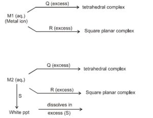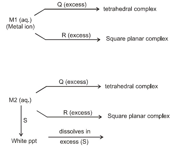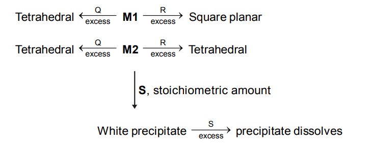 Let us consider the possiblities of M1. M1 should be able to form square planner complex (dsp ${ }^2$ hybridisation) as well as tetrahedral ( $\mathrm{sp}^3$ ). This rules out $\mathrm{Zn}^{2+} \& \mathrm{Cd}^{2+}\left[\because \mathrm{d}^{10}\right.$ configuration will not allow $\mathrm{dsp}^2$ hybridization]