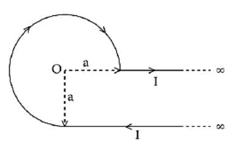 An infinite wire has a circular bend of radius a , and carrying a current I as shown in figure. The magnitude of magnetic field at the origin $O$ of the arc is given by :