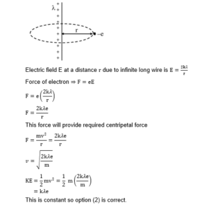 An infinitely long positively charged straight thread has a linear charge density $\lambda \mathrm{Cm}^{-1}$. An electron revolves along a circular path having axis along the length of the wire. The graph that correctly represents the variation of the kinetic energy of electron as a function of radius of circular path from the wire is: