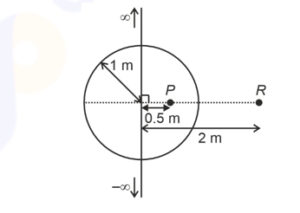 An infinitely long thin wire, having a uniform charge density per unit length of $5 \mathrm{nC} / \mathrm{m}$, is passing through a spherical shell of radius 1 m , as shown in the figure. A 10 nC charge is distributed uniformly over the spherical shell. If the configuration of the charges remains static, the magnitude of the potential difference between points $P$ and $R$, in Volt, is. [Given: $\ln \mathrm{SI}$ units $\frac{1}{4 \pi \dot{o}_0}=9 \times 10^9, \ln 2=0.7$. Ignore the area pierced by the wire.