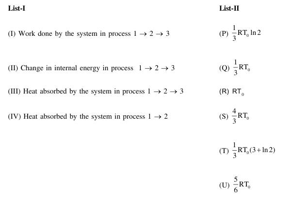 If the process carried out on one mole of monatomic ideal gas is as shown in figure in the PV-diagram with $P_0 V_0=\frac{1}{3} R T_0$, the correct match is,