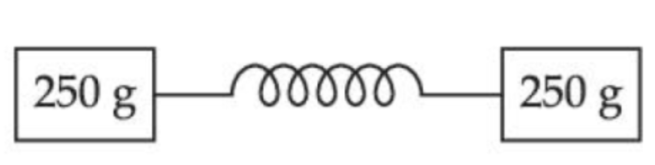 As per the given figure, two blocks each of mass 250g are connected to a spring of spring constant $2 \mathrm{Nm}^{-1}$. If both are given velocity v in opposite directions, then maximum elongation of the spring is :
