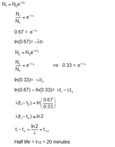 Calculate the time interval between 33% decay and 67% decay if half-life of a substance is 20 minutes.