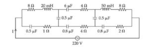 An inductor of $0.5 \mu \mathrm{H}$, a capacitor of $200 \mu \mathrm{~F}$ and a resistor of $2 \Omega$ are connected in series with a 220...