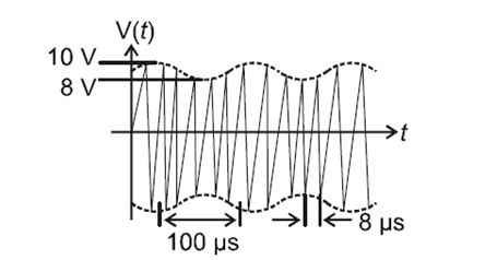 An amplitude modulated signal is given by $V(t)=10\left[1+0.3 \cos \left(2.2 \times 10^4 t\right)\right] \sin \left(5.5 \times 10^5 t\right)$. Here $t$ is in seconds. The sideband...