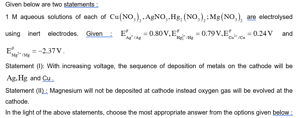 At 298 K , the standard reduction potential for $\mathrm{Cu}^{2+} / \mathrm{Cu}$ electrode is 0.34 V . Given: $\mathrm{K}_{\text {sa }} \mathrm{Cu}(\mathrm{OH})_2=1 \times 10^{-20}$ [JEE...