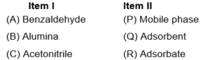 The correct match between Item I and Item II is : Item I Item II (A) Benzaldehyde (P) Mobile phase (B) Alumina (Q) Adsorbent...