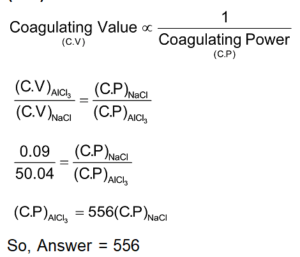 Coagulating value of electrolytes $\mathrm{AlCl}_3$ and NaCl for $\mathrm{As}_2 \mathrm{~S}_3$ are 0.09 and 50.04 respectively. The coagulating power of $\mathrm{AlCl}_3$ is x times the coagulating power of NaCl . The value of x is $\_\_\_\_$ .