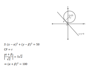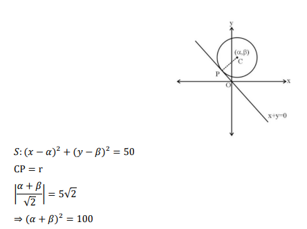 Consider a circle $(x-\alpha)^2+(y-\beta)^2=50$, where $\alpha, \beta>0$. If the circle touches the line $y+x=0$ at the point P , whose distance from the origin is $4 \sqrt{2}$, then $(\alpha+\beta)^2$ is equal to
