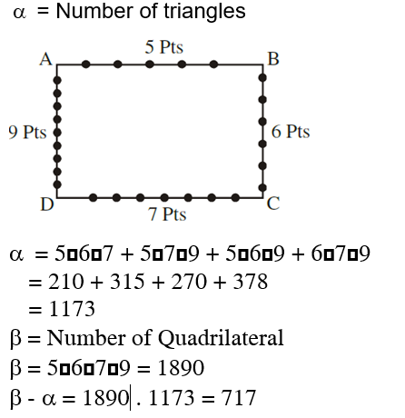 Consider a rectangle ABCD having $5,7,6,9$ points in the interior of the line segments $A B, C D, B C, D A$ respectively. Let $\alpha$ be the number of triangles having these points from different sides as vertices and $\beta$ be the number of quadrilaterals having these points from different sides as vertices. Then $(\beta-\alpha)$ is equal to :