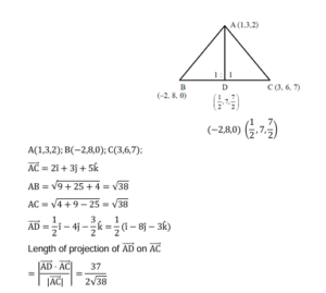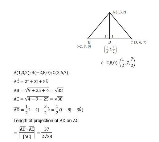 Consider a $\triangle \mathrm{ABC}$ where $\mathrm{A}(1,2,3), \mathrm{B}(-2,8,0)$ and $\mathrm{C}(3,6,7)$. If the angle bisector of $\angle \mathrm{BAC}$ meets the line $B C$ at $D$, then the length of the projection of the vector $\overrightarrow{A D}$ on the vector $\overrightarrow{A C}$ is: