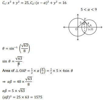 Consider two circles $\mathrm{C}_1: \mathrm{x}^2+\mathrm{y}^2=25$ and $\mathrm{C}_2:(\mathrm{x}-\alpha)^2+y^2=16$, where $\alpha \in(5,9)$. Let the angle between the two radii (one to each circle) drawn from one of the intersection points of $C_1$ and $C_2$ be $\sin ^{-1}\left(\frac{\sqrt{63}}{8}\right)$. If the length of common chord of $C_1$ and $\mathrm{C}_2$ is $\beta$, then the value of $(\alpha \beta)^2$ equals