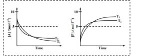 For a reaction, $\mathrm{A} \rightleftharpoons \mathrm{P}$, the plots of $[\mathrm{A}]$ and $[\mathrm{P}]$ with time at temperatures $T_1$ and $T_2$ are given below. If $\mathrm{T}_2>\mathrm{T}_1$, the correct statement(s) is (are) (Assume $\Delta \mathrm{H}^{\ominus}$ and $\Delta \mathrm{S}^{\ominus}$ are independent of temperature and ratio of $\ln K$ at $\mathrm{T}_1$ to $\ln K$ at $\mathrm{T}_2$ is greater than $\mathrm{T}_2 / \mathrm{T}_1$. Here $H, S, G$ and $K$ are enthalpy, entropy, Gibbs energy and equilibrium constant, respectively.)