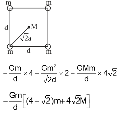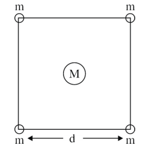 Four spheres each of mass m form a square of side d (as shown in figure). A fifth sphere of mass M is situated at the centre of square. The total gravitational potential energy of the system is :