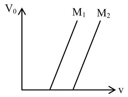 Statement-I: Figure shows the variation of stopping potential with frequency ( $v$ ) for the two photosensitive materials $M_1$ and $M_2$. The slope gives value of $\frac{\mathrm{h}}{\mathrm{e}}$, where h is Planck's constant, e is the charge of electron.