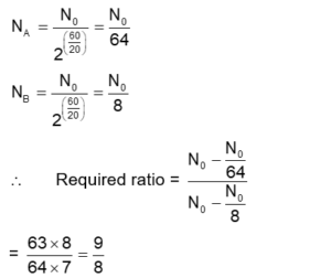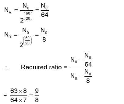 Half lives of two radioactive nuclei A and B are 10 minutes and 20 minutes, respectively. If, initially a sample has equal number of nuclei, then after 60 minutes, the ratio of decayed numbers of nuclei A and B will be :