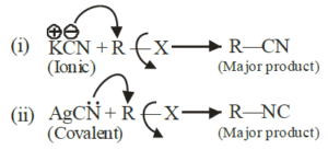 Assertion (A) : Haloalkanes react with KCN to form alkyl cyanides as a main product while with AgCN form isocyanide as the main product.