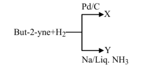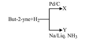 But-2-yne and hydrogen (one mole each) are separately treated with (i) $\mathrm{Pd} / \mathrm{C}$ and (ii) $\mathrm{Na} /$ liq. $\mathrm{NH}_3$ to give the products X and Y respectively.