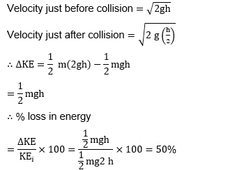 If a rubber ball falls from a height h and rebounds upto the height of h/2. The percentage loss of total energy of the initial system as well as velocity ball before it strikes the ground, respectively, are :