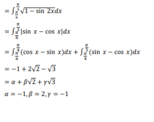 If $\int_{\frac{\pi}{6}}^{\frac{\pi}{3}} \sqrt{1-\sin 2 x} d x=\alpha+\beta \sqrt{2}+\gamma \sqrt{3}$, where $\alpha, \beta$ and $\gamma$ are rational numbers, then $3 \alpha+4 \beta-\gamma$ is equal to