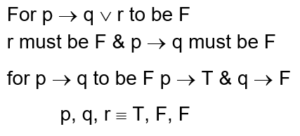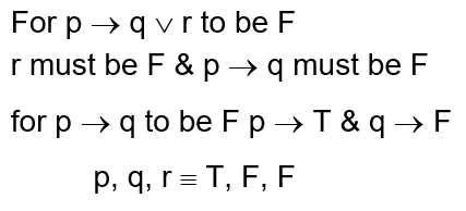 If $p \Rightarrow(q \vee r)$ is false, then truth values of $p, q, r$ are respectively: